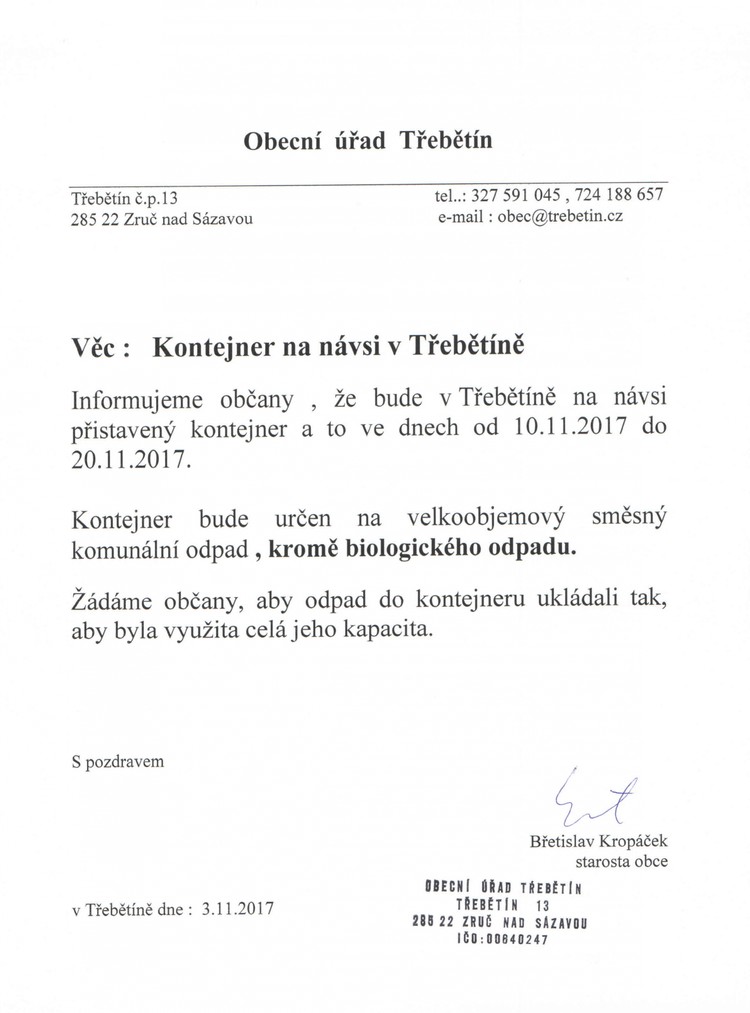 Oznámení - Aktuality - Obec Třebětín