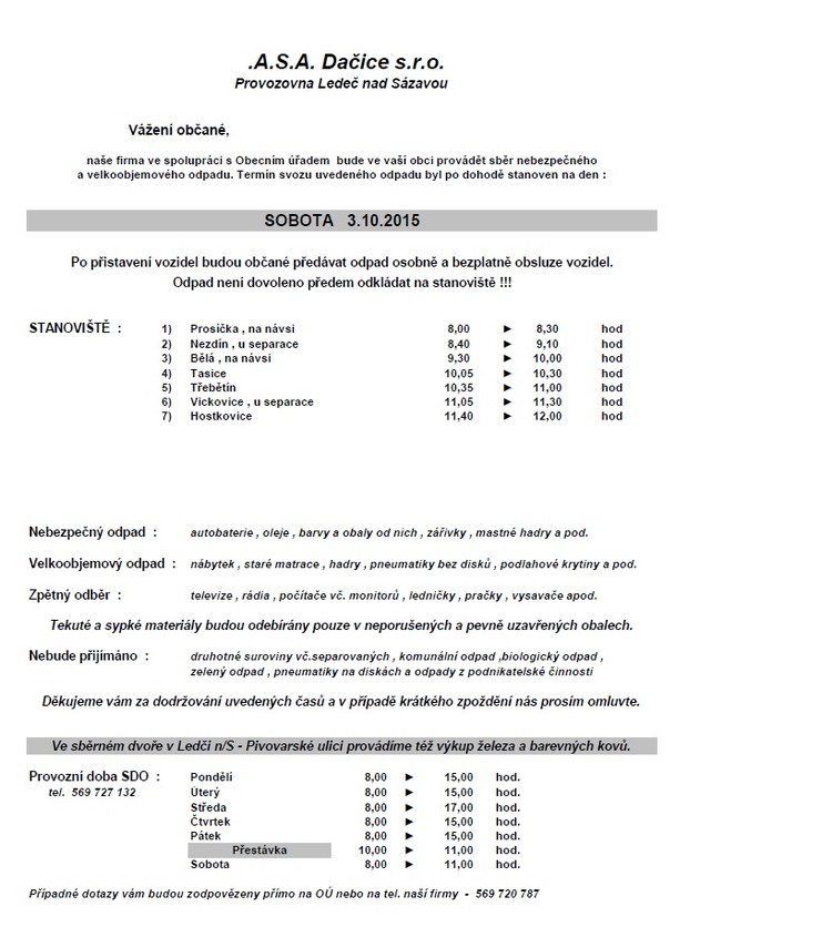 Ve Třebětíně bude chodit ve středu 2.9. a ve čtvrtek 3.9.2015 též dopoledne.
