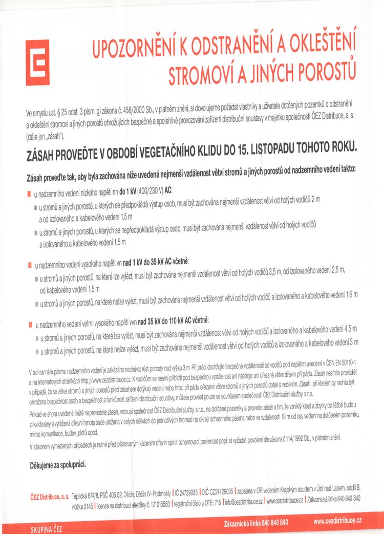 Dne 14.9.2015 od 7.30 do 16.00 hodin bude přerušena dodávka elektrické energie ve Víckovicích.